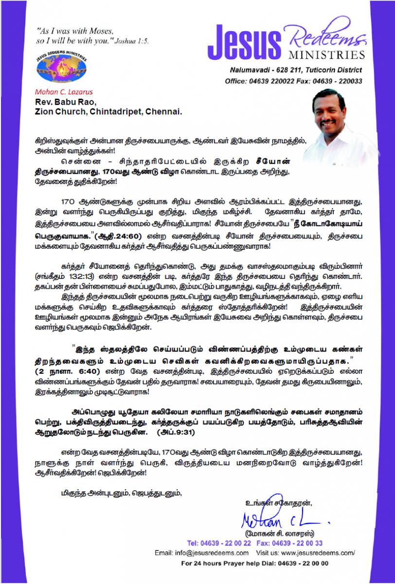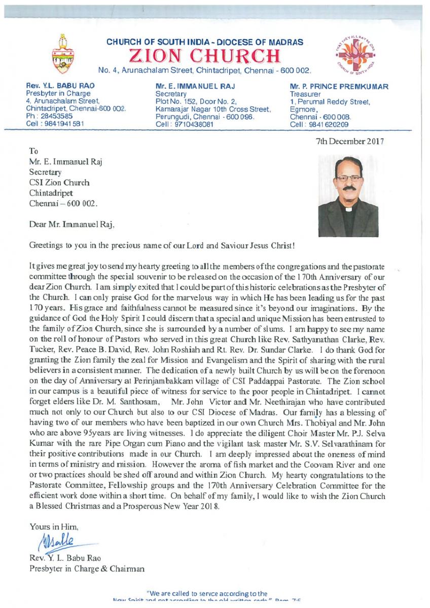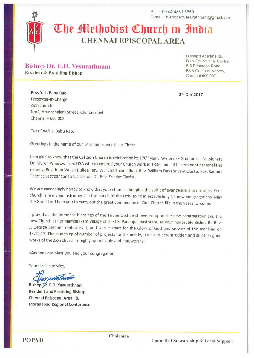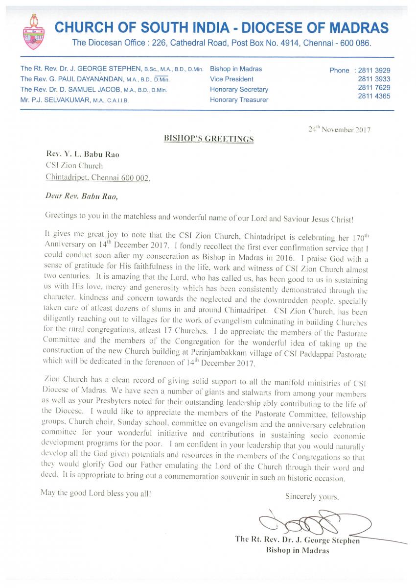 170th Anniversary Greetings December 2, 2017 | No Comments 170th Anniversary Greetings Rt. Rev. Dr.J. George Stephen, Bishop in Madras Rev. Y.L.Babu Rao Mohan C Lazarus Rev. Pastor D. Mohan Bishop Dr. M.Prakash Bishop Dr.E.D.Yesurathnam Rev. M. Prabakar Rajasekar M.Stephen Thankappa Mr.M.Vijayakumar, IAS C Samuel Chellaiah Dr.A.Edwin Joe Events